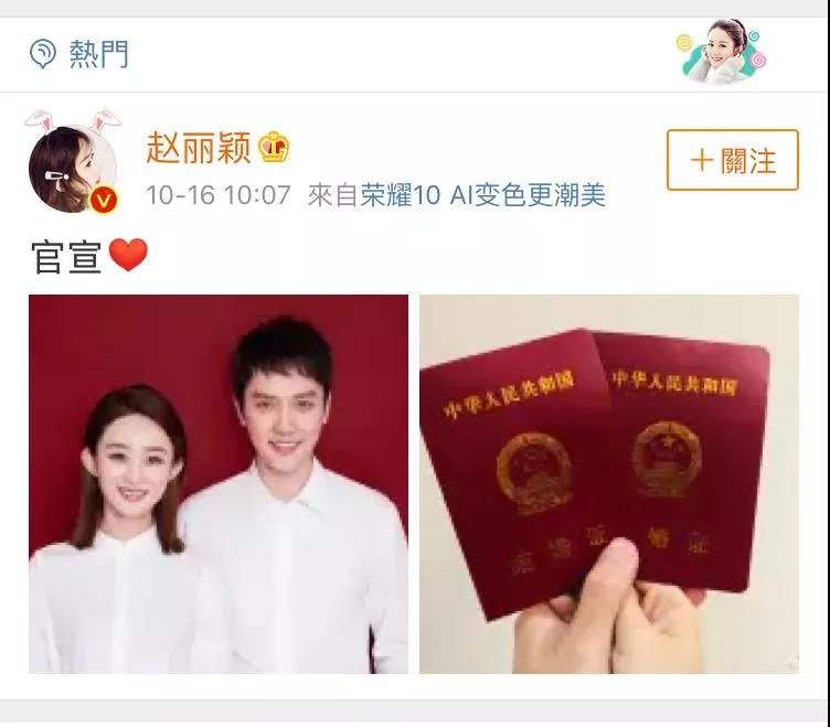同时在微博上晒出结婚证!